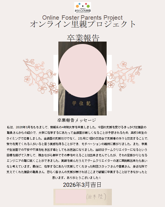 学生さんを応援したいとお考えの方は、ぜひ一度、みらいこども財団『オンライン里親プロジェクト』までお問い合わせください。