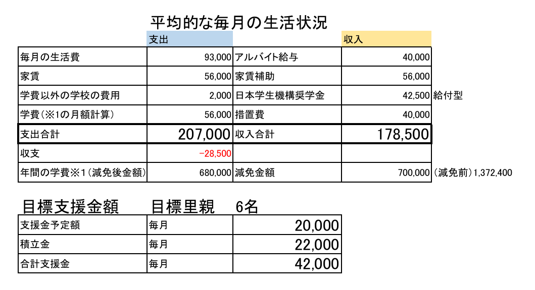 目標金額 支援者一人あたり 12万円/年 × 2年間 募集人数6人
